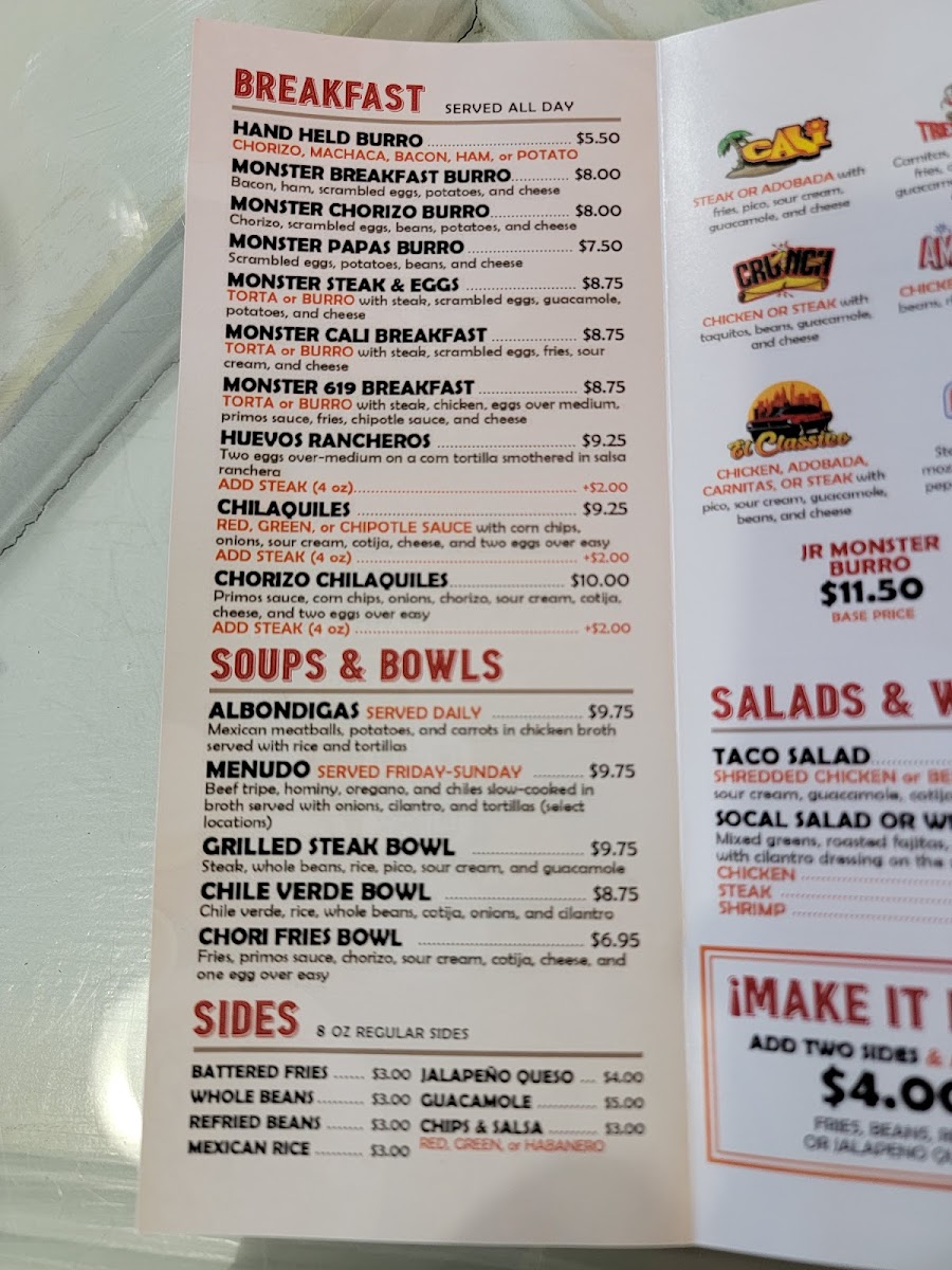 Steak, scrambled eggs, guacamole, potatoes, and cheese. Try your favorite breakfast burro as a JR Burro, Torta, Breakfast Bowl, or Monster Burro!